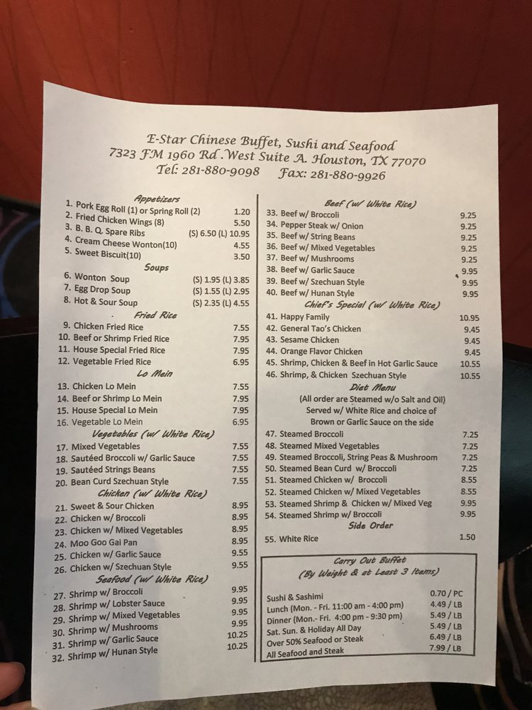 E Star, located in Houston, TX, offers a wide range of Chinese dishes with a focus on fresh ingredients and excellent service. With options for vegans and vegetarians, as well as traditional meat dishes, the menu caters to a variety of tastes. The appetizers, such as Pork Egg Rolls and Fried Chicken Wings, set the tone for a satisfying meal. The soups, including Wonton and Hot and Sour Soup, are flavorful and comforting. The Fried Rice options, like Chicken and House Special, are hearty and well-seasoned. Customers praise E Star for its fresh food, friendly staff, and cozy atmosphere. Whether dining in or taking out, E Star provides a delightful dining experience for all.